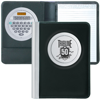 solar power calculator - large LCD display - raised rubber keys - colored jewel tone binding - business card holder - 4" x 6" pad included - inside pen loop - ballpoint pen included