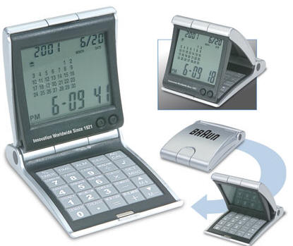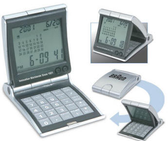 COMBO TRAVEL CALCULATOR - push button auto-open feature - clock or clock/calculator positions - large easy read LCD display - full function calculator - world time clock with 16 cities - selectable alarm tones - count down time - month, day, year & full month calendar - rubber keys