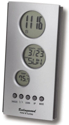 STATION DESK CLOCK - extra large easy read LCD displays - top LCD time - middle LCD month, date, day - bottom LCD temperature - alarm with snooze function - raised rubber keys
