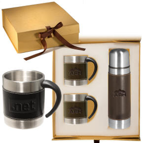 Leather Steel Vacuum Bottle and 2 Mug Gift Bin