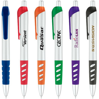 METALLIC BALLPOINT PEN - retractable ballpoint pen - metallic silver barrel - colored trim & matching rubber grip